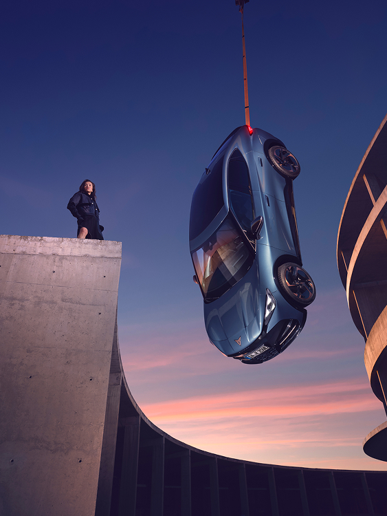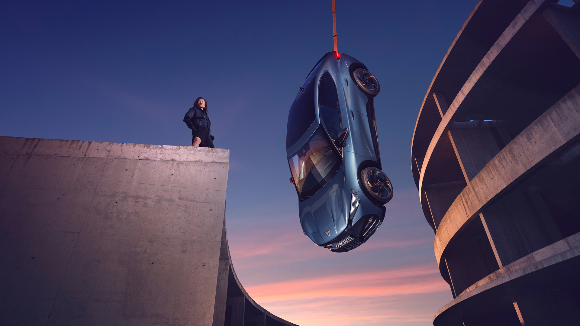 CUPRA Tavascan in Blau hängt vertikal an einem Seil vor einer urbanen Betonarchitektur, daneben eine Person auf einer Plattform, Hintergrund mit violettem Himmel.